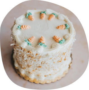Moist spice cake chock-full of carrots, pecans, pineapple & coconut, finished with fluffy cream cheese icing and toasted coconut.