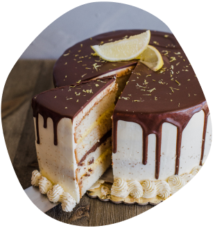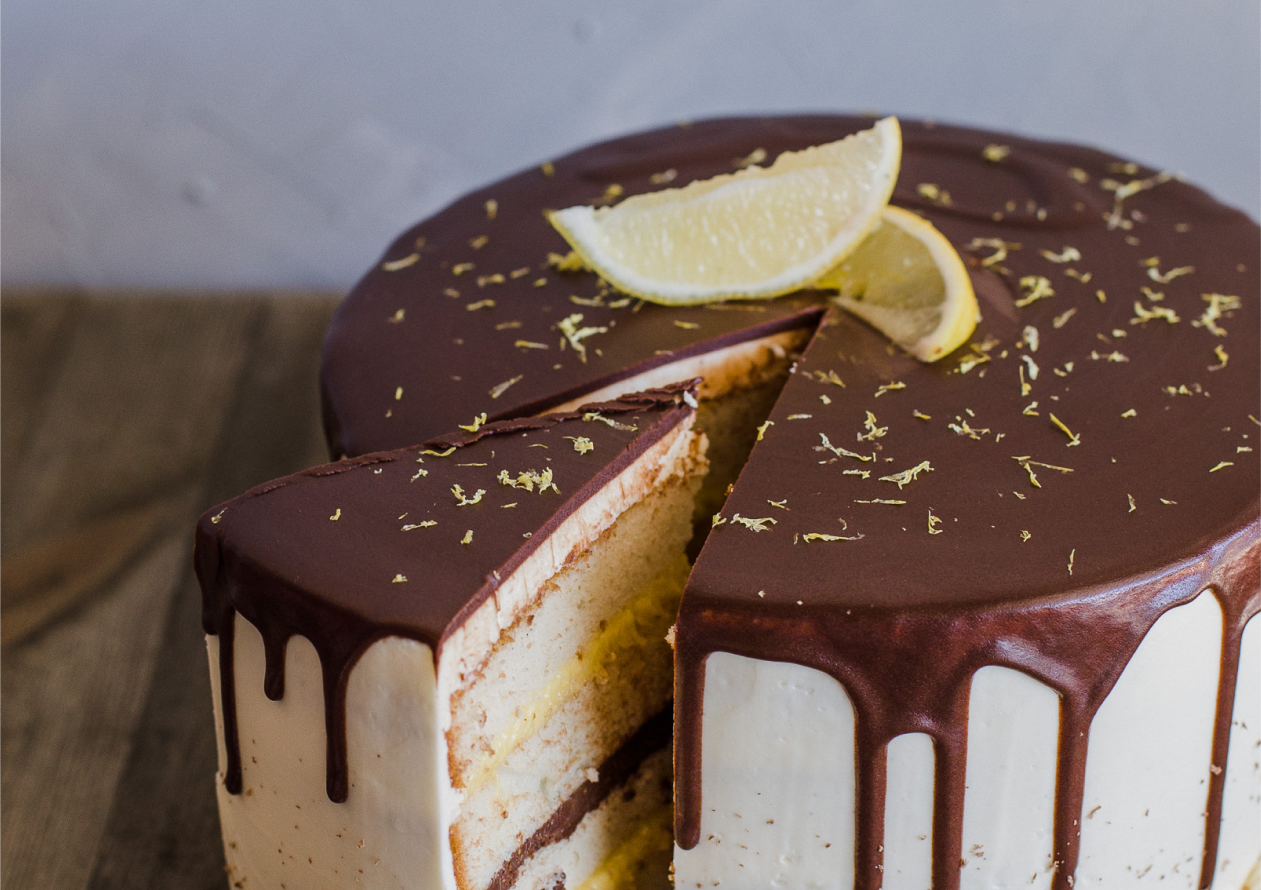 Vanilla bean cake filled with chocolate ganache and lemon curd, frosted with lemon buttercream and enrobed in chocolate ganache.