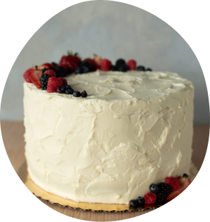 Vanilla cake filled with vanilla bean pastry cream, finished with Swiss buttercream and berries.