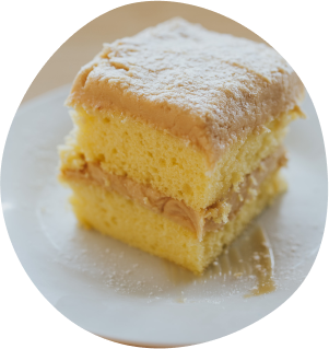 Fluffy vanilla cake layered with lemon curd, finished with lightly sweetened whipped cream.