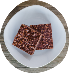 Walnut and date base topped with dark chocolate, peanut butter, and rice crisps.