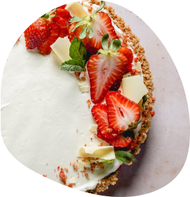 Oat flour crust, strawberry compote center, topped with basil-infused whipped white chocolate ganache.